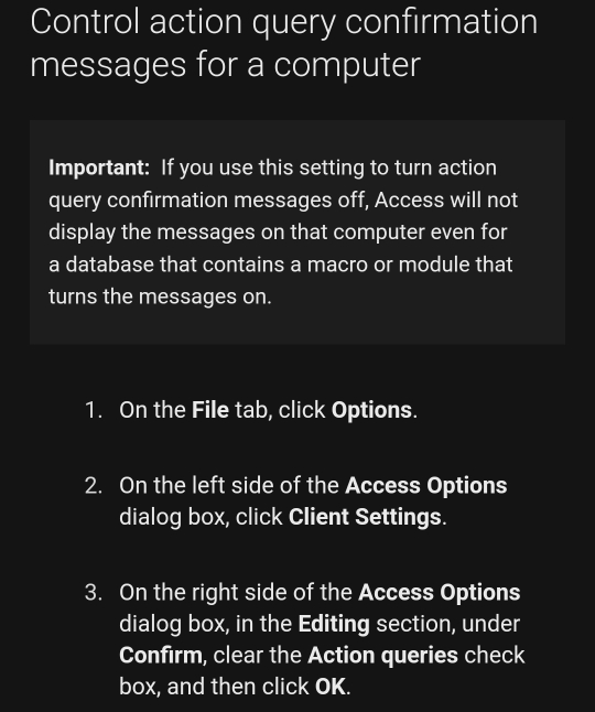 https://support.microsoft.com/en-us/office/turn-delete-object-and-action-query-confirmation-messages-on-or-off-e58e4bba-9d54-4b9d-b962-9eca048e5335